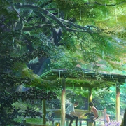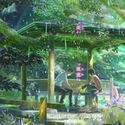 年方15岁的高中生秋月孝雄(入野自由 配音),专心学业的过程中不得不为了生计打工赚钱。母亲离家出走,他与哥哥过着看不到前方的生活。入梅之日,孝雄逃课来到日本庭园。在一座安静的小亭子里,27岁的职场女性雪野百香里(花泽香菜 配音)边吃巧克力边饮啤酒的样子引起了孝雄的注意。似曾相识的二人,仿佛约定好了一般,每到落雨之日便从世俗的烦恼中逃脱出来,相会于这座钢筋铁骨都市丛林中宛若世外桃源的幽静角落。在梅雨季节的日子里,他们的心渐渐向彼此靠拢。志愿成为手工鞋匠的秋月,决心以雪野为模特做一双鞋。 雨过天晴,艳阳高照,庭园中久久不见秋月和雪野的身影,相会无期亦有期……